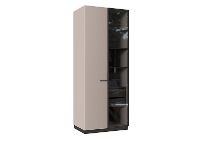 - За глухим фасадом шкафа МИ-201.03 установлена штанга для одежды и полка ЛДСП, за стеклянным – 3 полки ЛДСП;